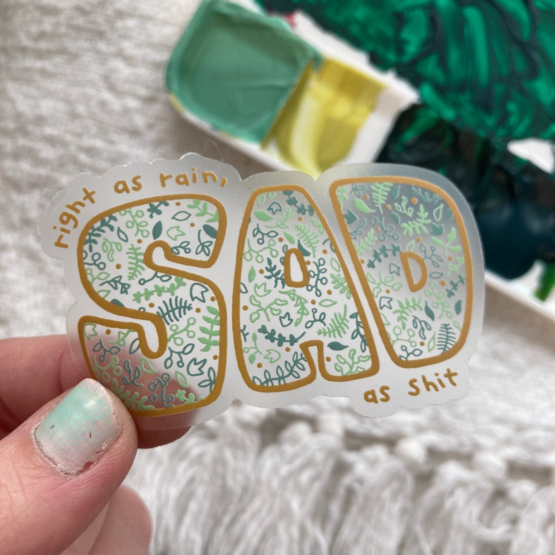 sticker reads "right as rain, SAD as shit.